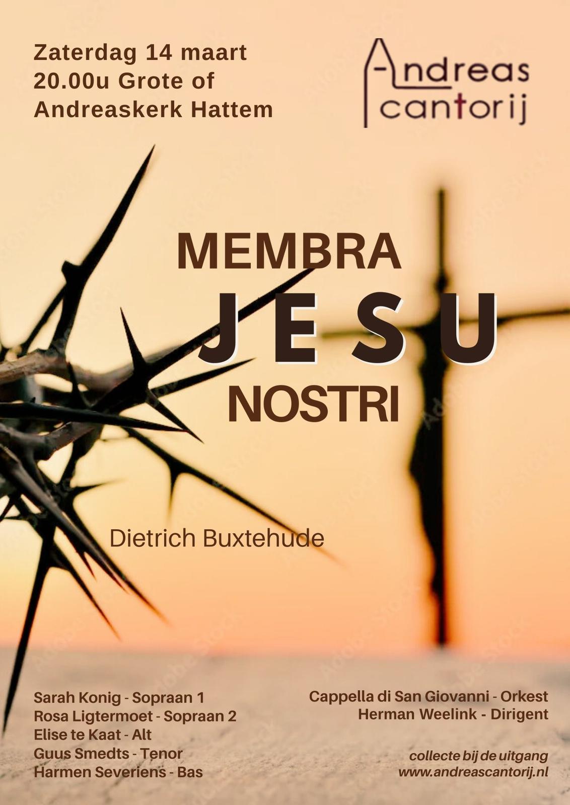 Op zaterdag 14 maart zal de Andreascantorij een bijzonder concert ten gehore brengen: het zeventiende-eeuwse werk Membra Jesu Nostri van Dietrich Buxtehude, een werk uit de vroege barok met veel emotie en een sterke verbinding tussen woord en muziek. Het concert onder leiding van Herman Weelink vindt plaats in de Grote of Andreaskerk Hattem. Solisten Sarah Konig (sopraan 1), Rosa Ligtermoet (sopraan 2), Elise te Kaat (alt), Guus Smedts (tenor) en Harmen Severiens (bas) verlenen hun medewerking. Het geheel zal begeleid worden door het orkest Cappella di San Giovanni, waarbij gebruik gemaakt zal worden van oude instrumenten.